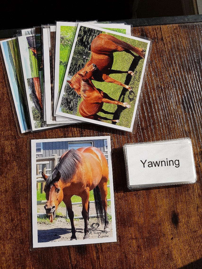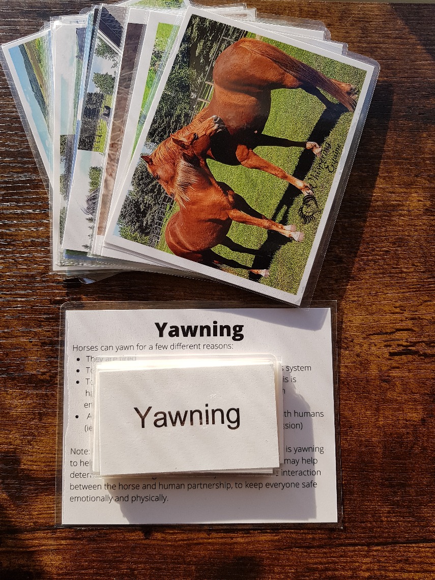 This fun matching card game was designed to help individuals learn more about how horses communicate with each other and us! There are 14 cards with photos of horses either demonstrating a behaviour or expression on the front and then a description of that behaviour or expression on the back. The small cards are the matching words that the player should try to place with the correct photo card.